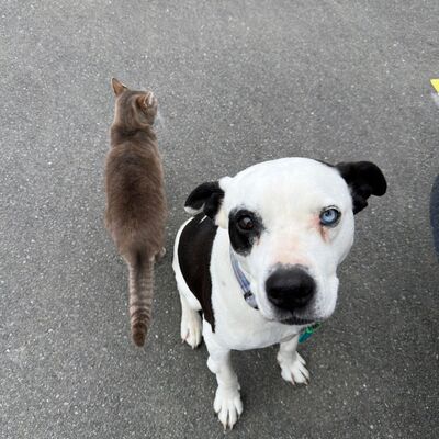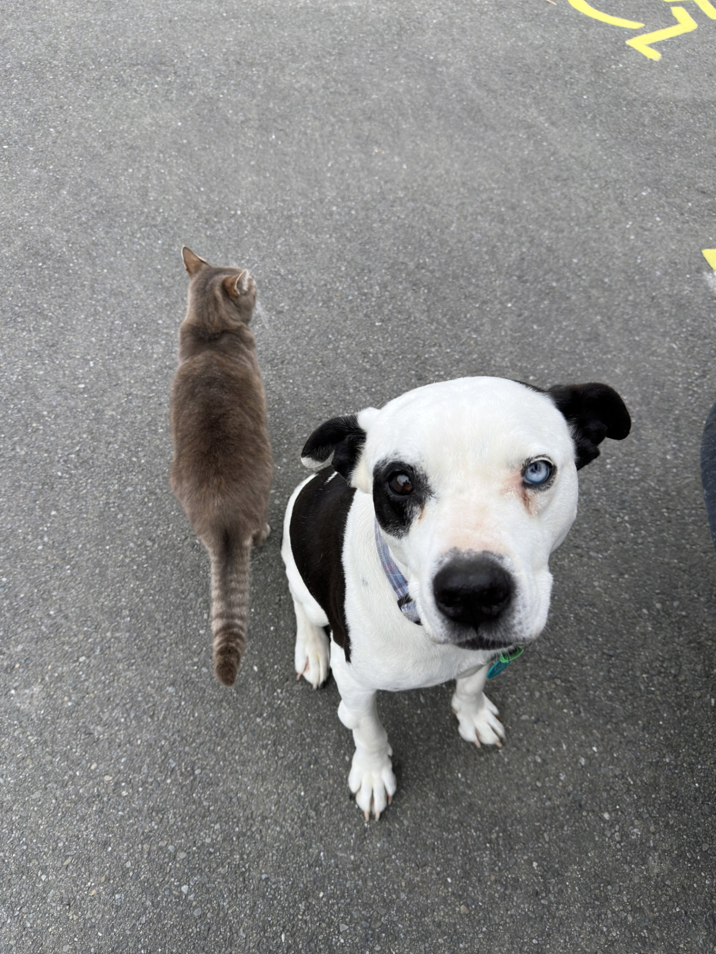 Danach eingekauft, um daheim zu frühstücken. Dort werde ich sofort von zwei Hunden und einer zweiten Katze in Beschlag genommen. Diese Kombination sieht man so auch nicht oft. Also 10 Minuten mit den dreien gespielt und geknuddelt. Bis es dann auch anfängt zu regnen.