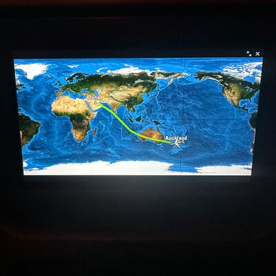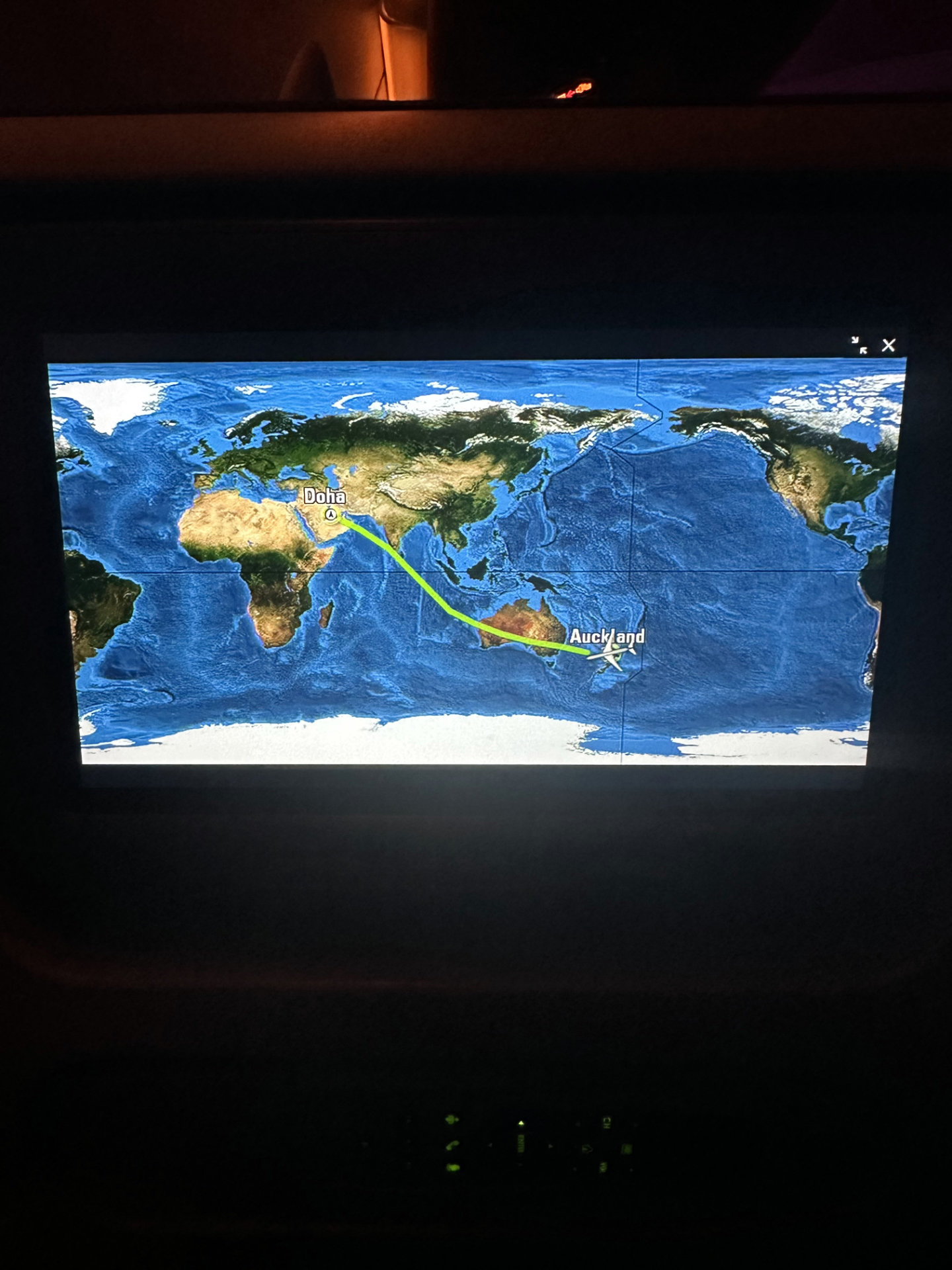 Flugreise von 16h von Doha nach Auckland mit einer Boeing 777-200LR verläuft erstaunlich reibungslos. Oder ich hab es verpennt, da der Start um 4 Uhr morgens gewesen ist. Geweckt werde ich immer wieder, weil man mir unbedingt was servieren möche. Allerdings ist mein Magen immer noch in der mitteleuropäischen Zeitzone.