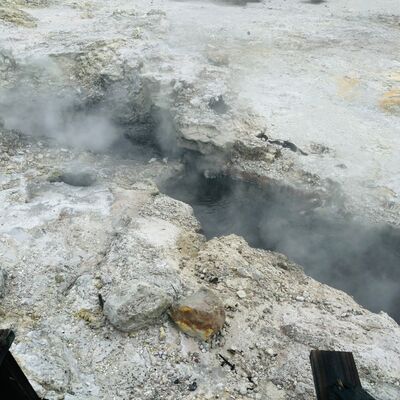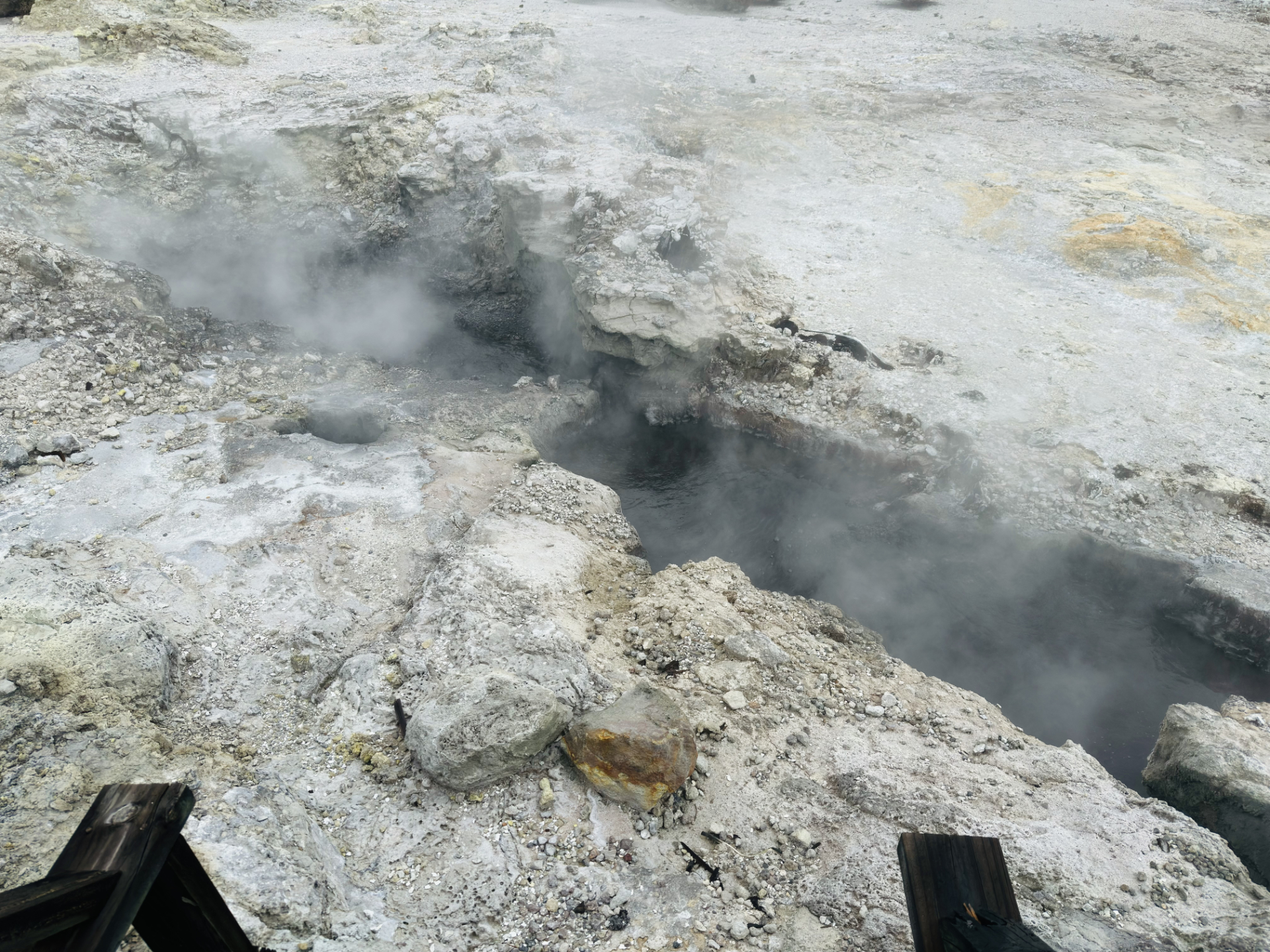 Vor dem Ort begrüsst mich dann ein freundliches Schild mit der Inschrift "Hell's Gate" und es riecht nach Schwefel. Okay, also wirklich wie Olten. ich steige mal aus und entdecke, dass es da heisse Therme gibt. Ah, ja... Höllentor.. kreativ. Ich gebe Charon, dem Kassierer, einen Obulus von NZD 45, will explizit eine nicht geführte Tour und marschierte los. Links und rechts dampfte und blubberte es. Vorne verweilt eine Gruppe mit einem übermotivierten Führer, der meinen Entscheid als absolut richtig bestätigt.