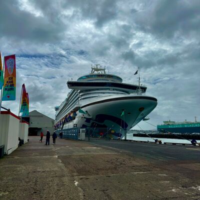 Ich laufe so ca. 2-3 km also zum Hafen, vorbei an schönen und nicht so schönen Häusern. Es ist windig. Am Hafen ankerte stattlich die Crown Princess und wird mit Mensch und Material befüllt. Ein paar Fotos hier, ein paar Fotos da... Es windet immer wilder. Der Blick auf die Hülle zeigt plötzlich fast gähnende Leere. Ich glaub, da war noch mehr drin als die Parkkarte, wie z.B. Kredit- und Debitkarte?