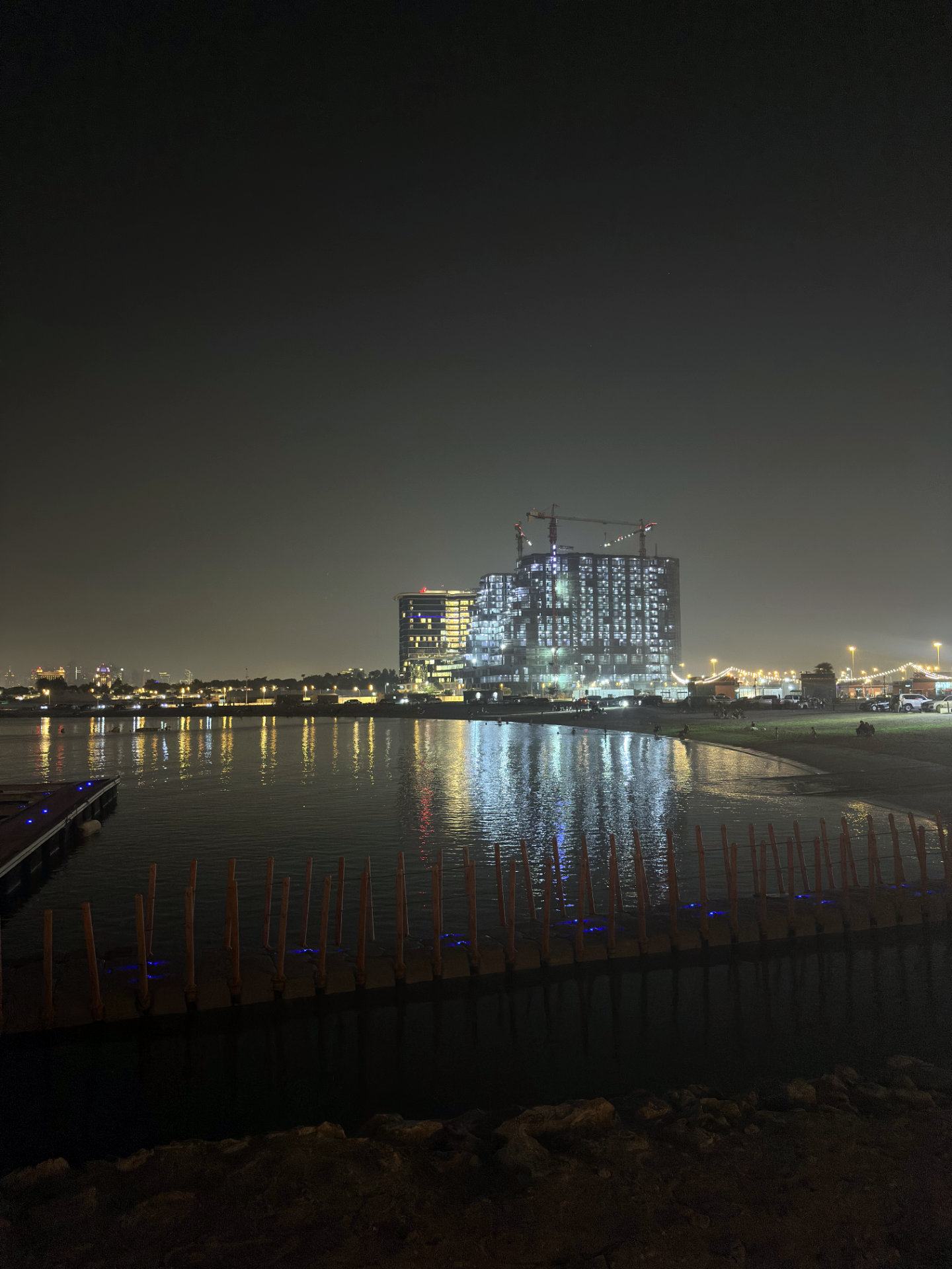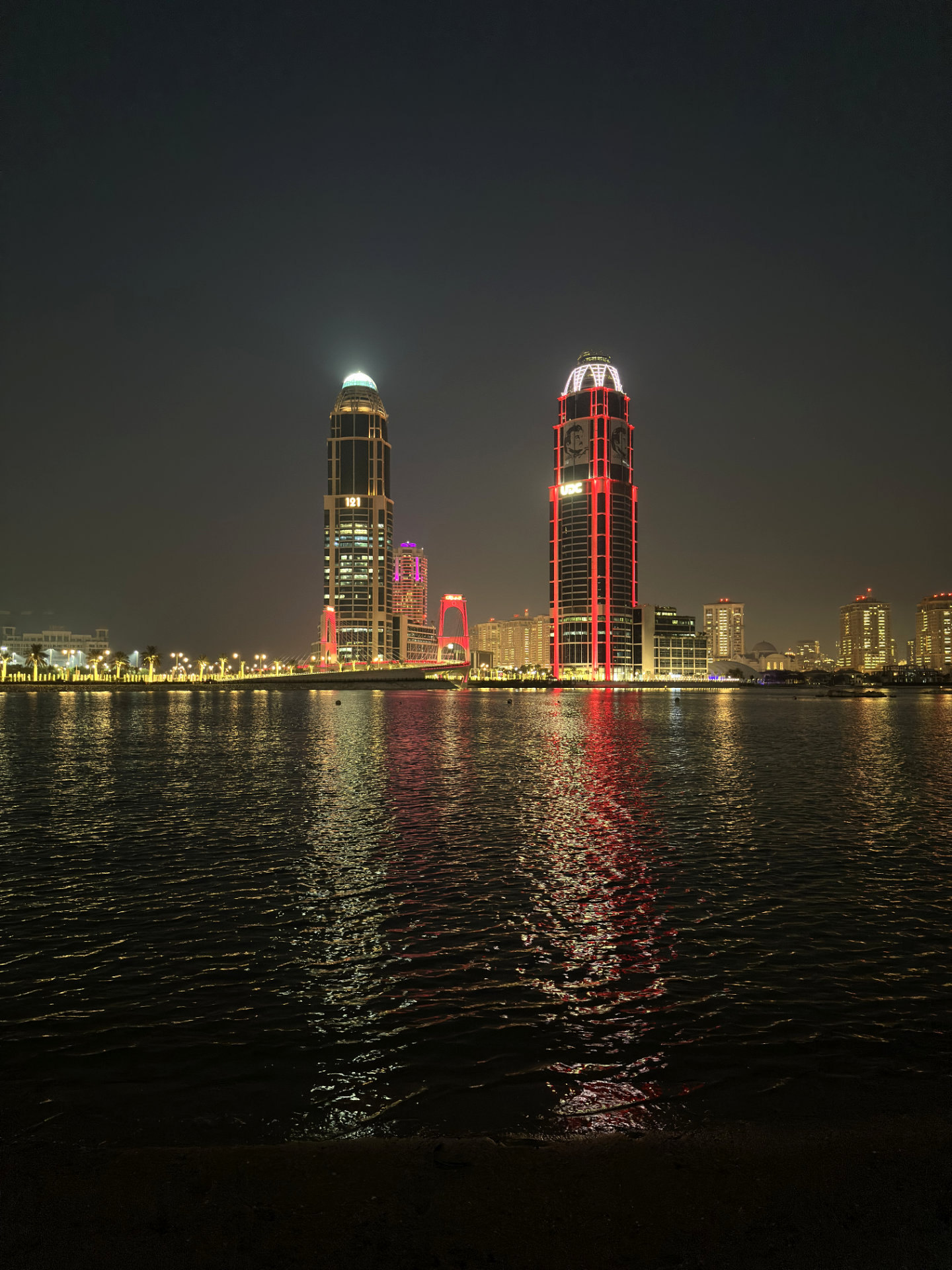 Lohn für meine Mühsal ist ein gesundes, sorgfältige nach Nährwerten ausgewogenes Nachtessen mit einem schönen Ausblick auf die künstliche Pearl-Insel. Philips Hue auf Steoriden.